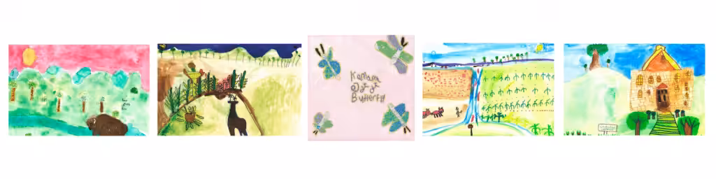 The drawings by the Tahlequah elementary schoolers — who were excited to see their own creations featured in an art exhibition — carry the charm inherent in all children’s artwork and are full of love and respect for the natural world: Fifth-grader Greyson’s aptly named drawing “Bison” shows an impressively detailed rendering of the animal crossing a stream; Kase, a first-grader, draws flourishing crops and livestock under a sunny sky in “I Am Grateful for Food,” showing a knowledge of food systems that rivals that of many adults. One student who participated, Lydia, reflected on the experience Coleman led, saying that it made her “feel like I am a part of my community.”